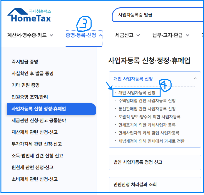 - 국세청 홈택스 접속 → 로그인 후 ‘사업자등록 신청’ 클릭