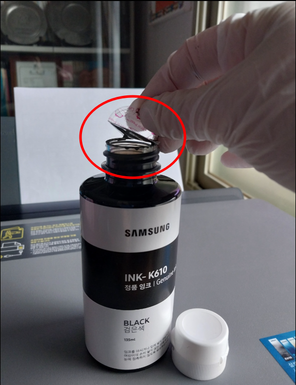- 잉크 탱크에 잉크가 거의 바닥인 상태에서도 새 잉크 135ml 병을 꽂으면 다 들어가지 않고 약간 남습니다. 남은 것은 잘 봉인해 두고 또 보충 사용하세요.